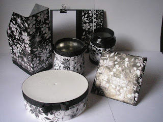 Da esquerda para direita: porta papel ou envelopes, note, latinhas para canetas e clipes, porta retrato de tiras (idéia liftada da scrapper Carla Landi) e o porta treco (ainda inacabado). Falta fazer o porta post it.